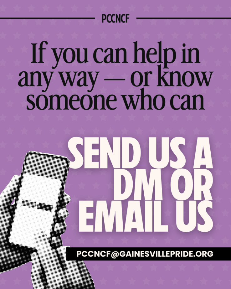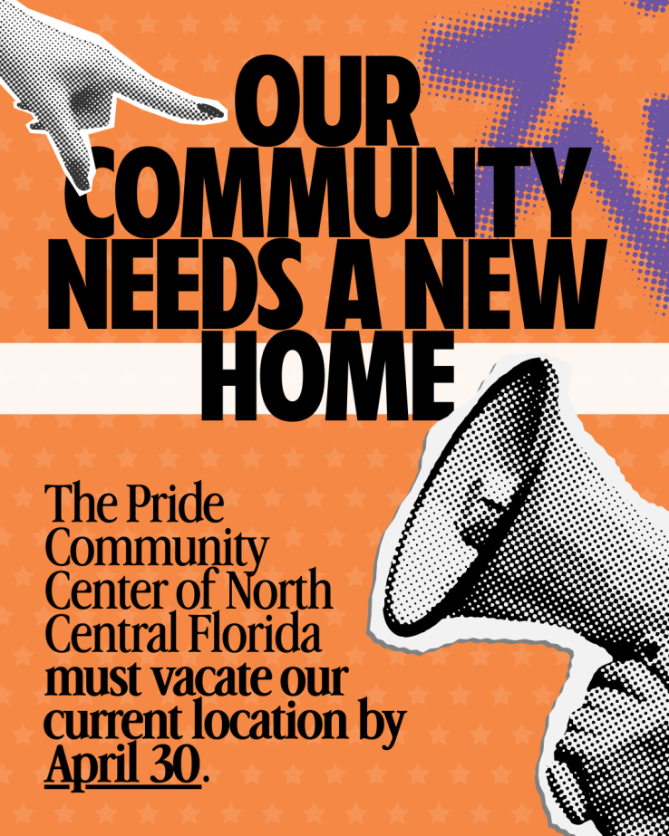 As a result, the Pride Community Center of North Central Florida must vacate our current location by April 30. Our Board of Directors has been working with many local offices, specialists, and experts to find a location and secure the funding needed to get a new space.